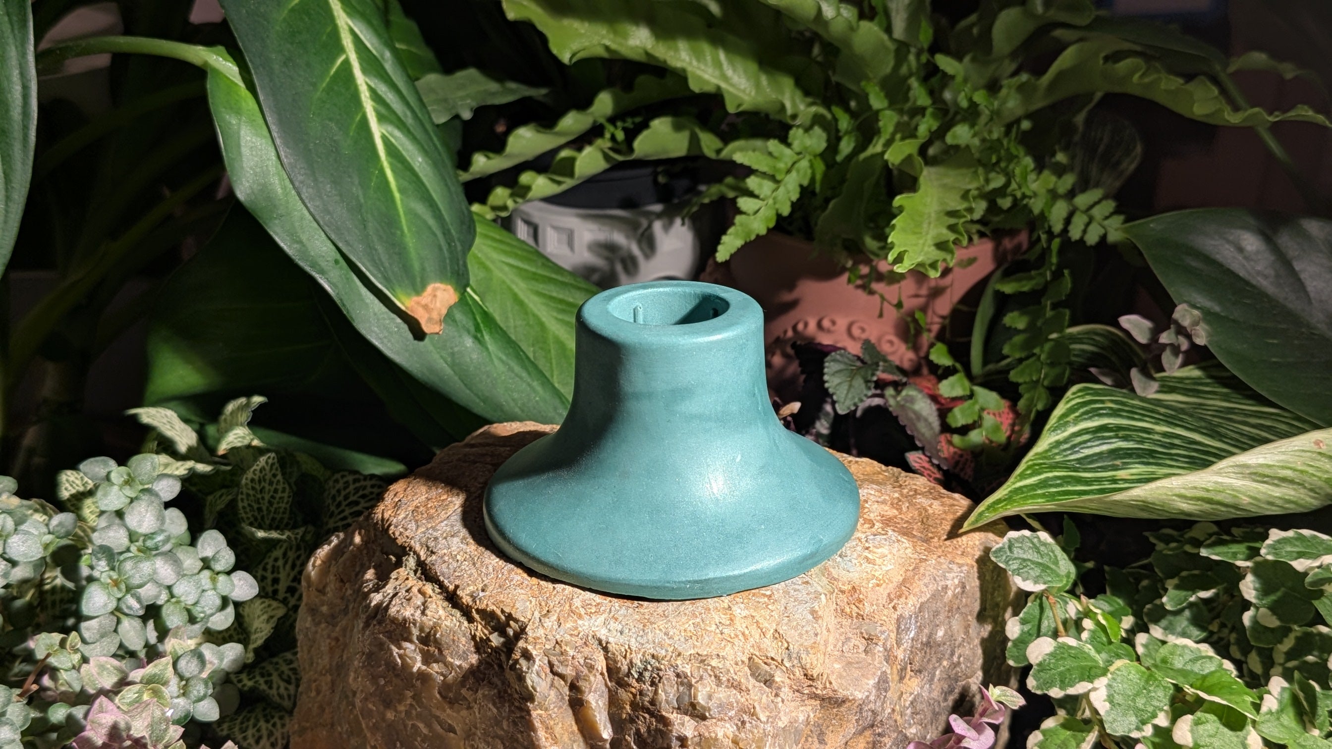 This Verdant Sanctum holder calls to the heart of the wild, its deep green hue like forest moss beneath morning dew. Simple yet grounded, it brings a breath of renewal to any space. When a taper candle burns atop it, the soft light seems to echo through hidden groves and secret paths.