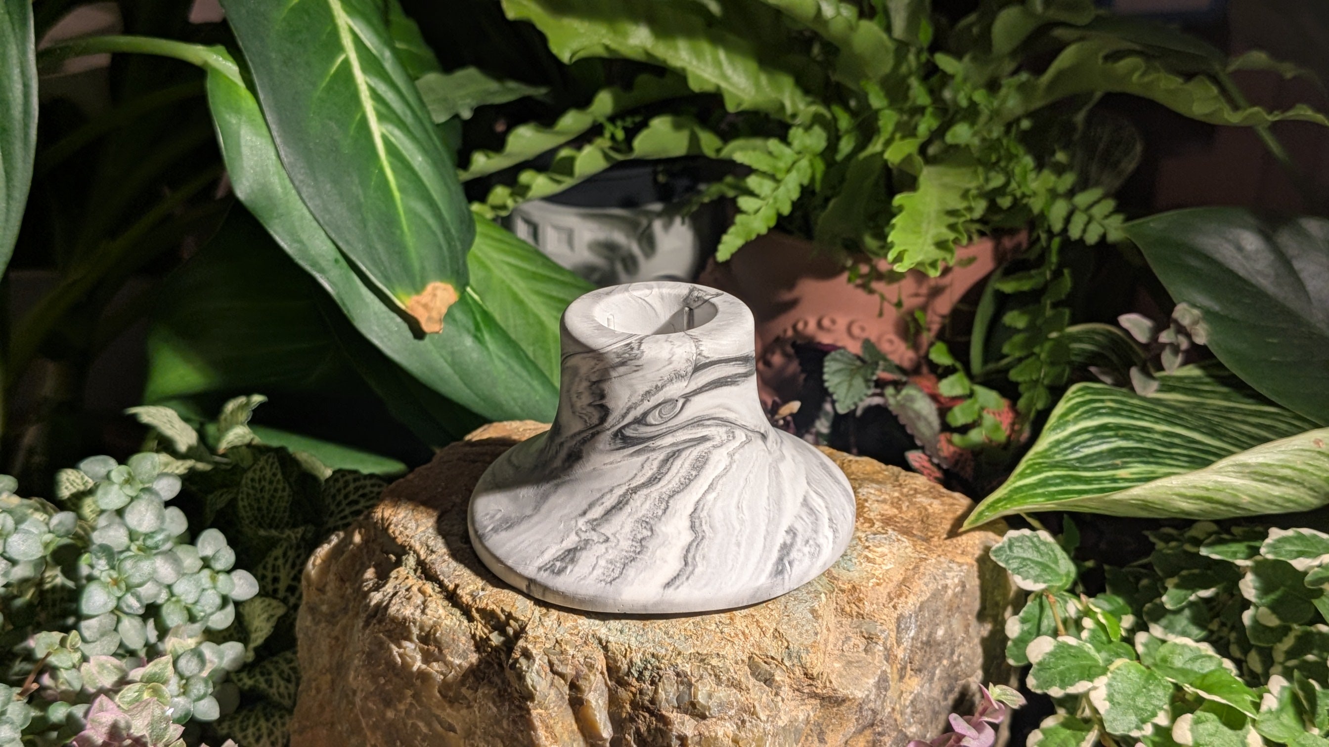 The Stoneveil Candle Holder captures the quiet elegance of shifting stone and shadow. Its swirling grey patterns evoke the calm strength of mountain fog or mist moving over marble cliffs. Balanced and grounded, it holds a taper candle with subtle grace, inviting a sense of stillness wherever it rests.