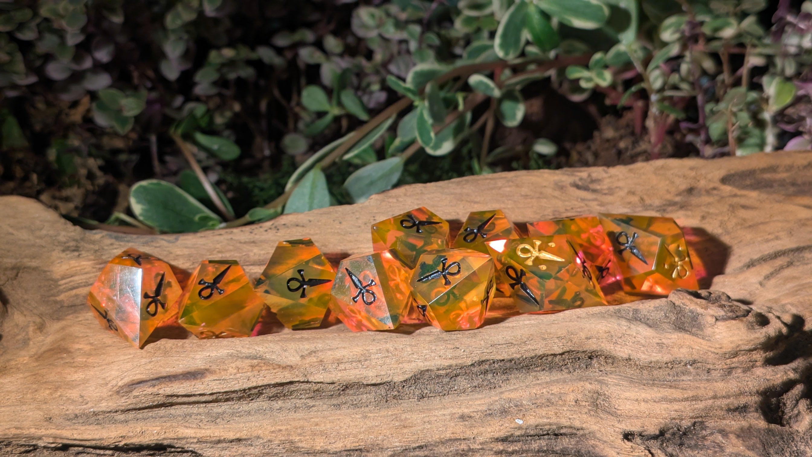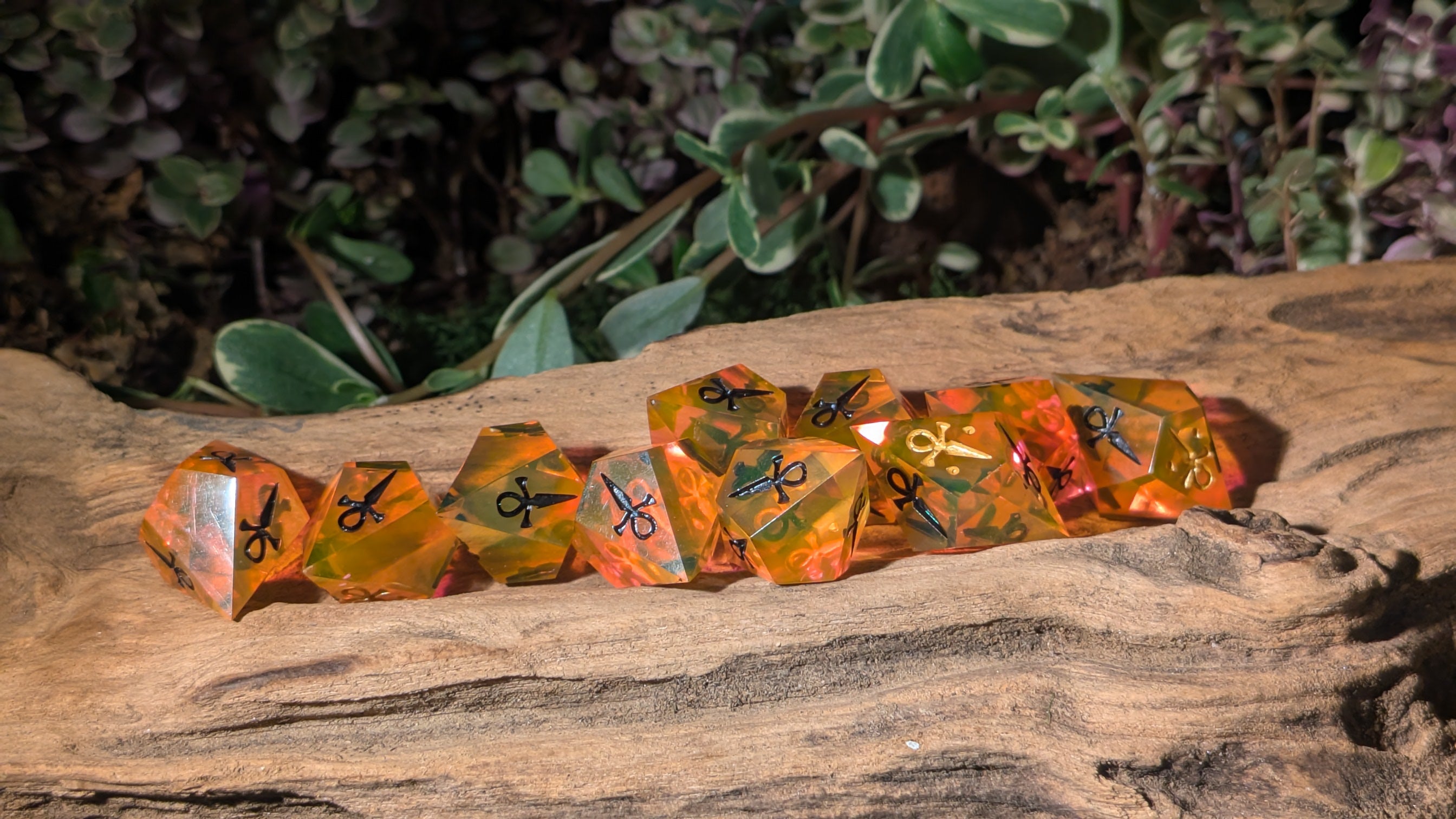 A riot of molten orange and fractured light, Asylum crackles with the frantic energy of a mind pushed to its edge. These dice glow with a feverish brightness, as if lit from within by thoughts that refuse to quiet down. Beneath the clarity of the shell, shifting embers coil and twist like overstimulated synapses, caught between brilliance and breakdown.