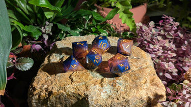 These 7-piece polyhedral dice are for those who walk the edge of daybreak, guided by brilliance and memory. Whether you are a celestial wanderer chasing lost constellations, a mage whose power waxes with the light, or a dreamer standing at the world’s end, these dice carry the promise of renewal within every cast.