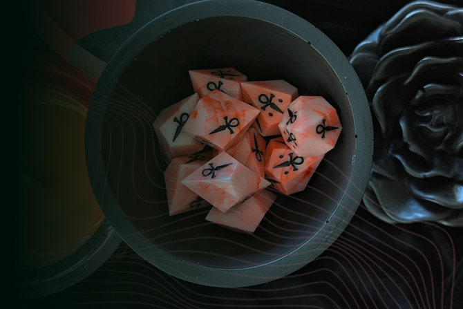 Celestial Silence reflects the quiet truth beneath the stars. Deep indigo and ember tones drift like frozen starlight, each die framed with an ornate critical success face that echoes the stillness between constellations. No heavens guide you. No cosmic voice stirs. Only your own hand shapes the path ahead.